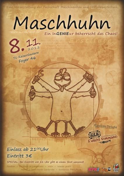 Am Donnerstag, 08.11.2012 rocken wir das "Maschhuhn", das ist die Erstsemsterfete der Fachschaft Maschinenbau an der TU Kaiserslautern!